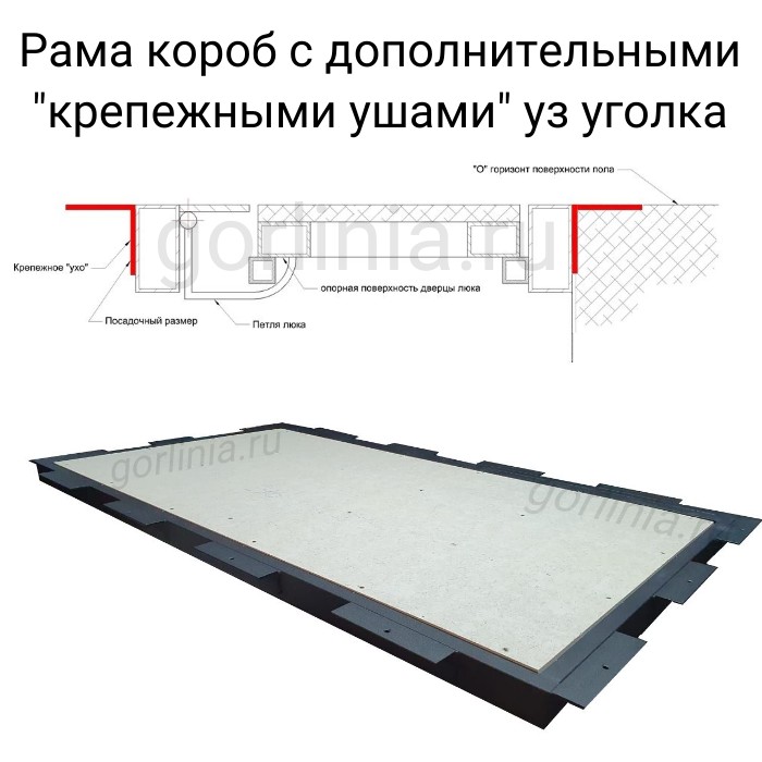 Рекомендуем заказать крепежные уголки, наваренные по периметру короба рамы, для фиксации в плите перекрытия. Услуга оплачивается отдельно. Рама уменьшается на толщину уголков для сохранения габаритов посадочного размера изделия.