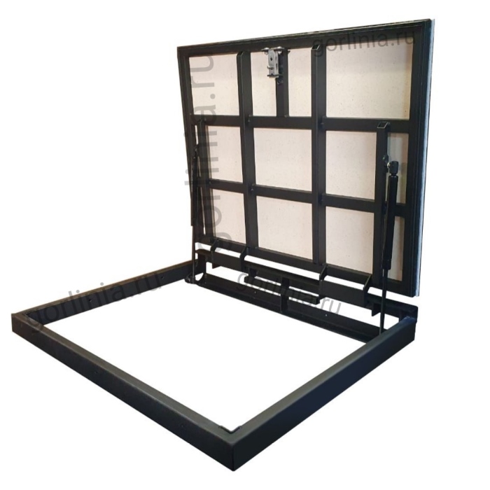 Эту модель можно монтировать даже после ремонта, когда пол вокруг напольного отверстия уже облицован плиткой, потому что крышка по трем сторонам опирается на раму из профиля, совпадающую с периметром отверстия в полу.