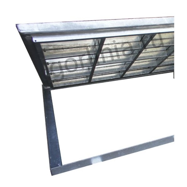 Рама исполнена из сортового уголка 50х5. Каркас двери с внешним кантом сварен с обвязкой профилем 50х25 с ячейкой в осях 300х300. Дно крышки закрыто оцинкованным листом 2 мм клепочным соединением с расчетной глубиной под настил декинга.