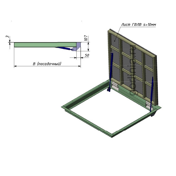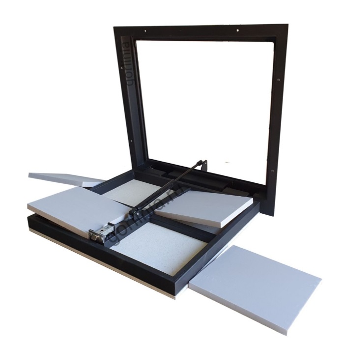 Облегченная рама из листового проката 3 мм с наличником, жесткий каркас полотна в обвязке трубой 30х20 заполнен гипсоволокнистым влагостойким листом над утеплителем под чистовую отделку плиткой.